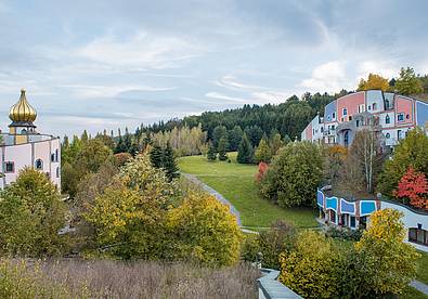 Begrünte und begehbare Dächer, die sich in die Landschaft integrieren bis hin zu unebenen Böden, bunten Farben, Formen und ungleichen Fenstern. Heute wird die Therme auch liebevoll „Hügelwiesenland“ genannt – eine treffende Beschreibung für die wundersame Anlage voller Oasen, die als Wirtschaftsimpulsgeber für die gesamte Region nachhaltig und zukunftsweisend agiert. Ein besonderer Ort, für besondere Menschen.